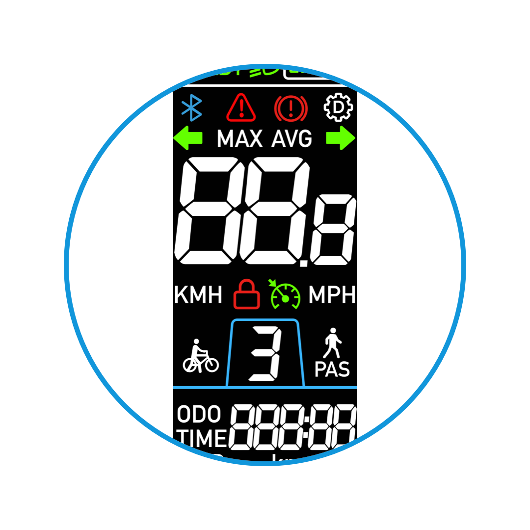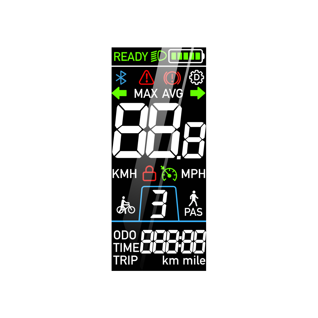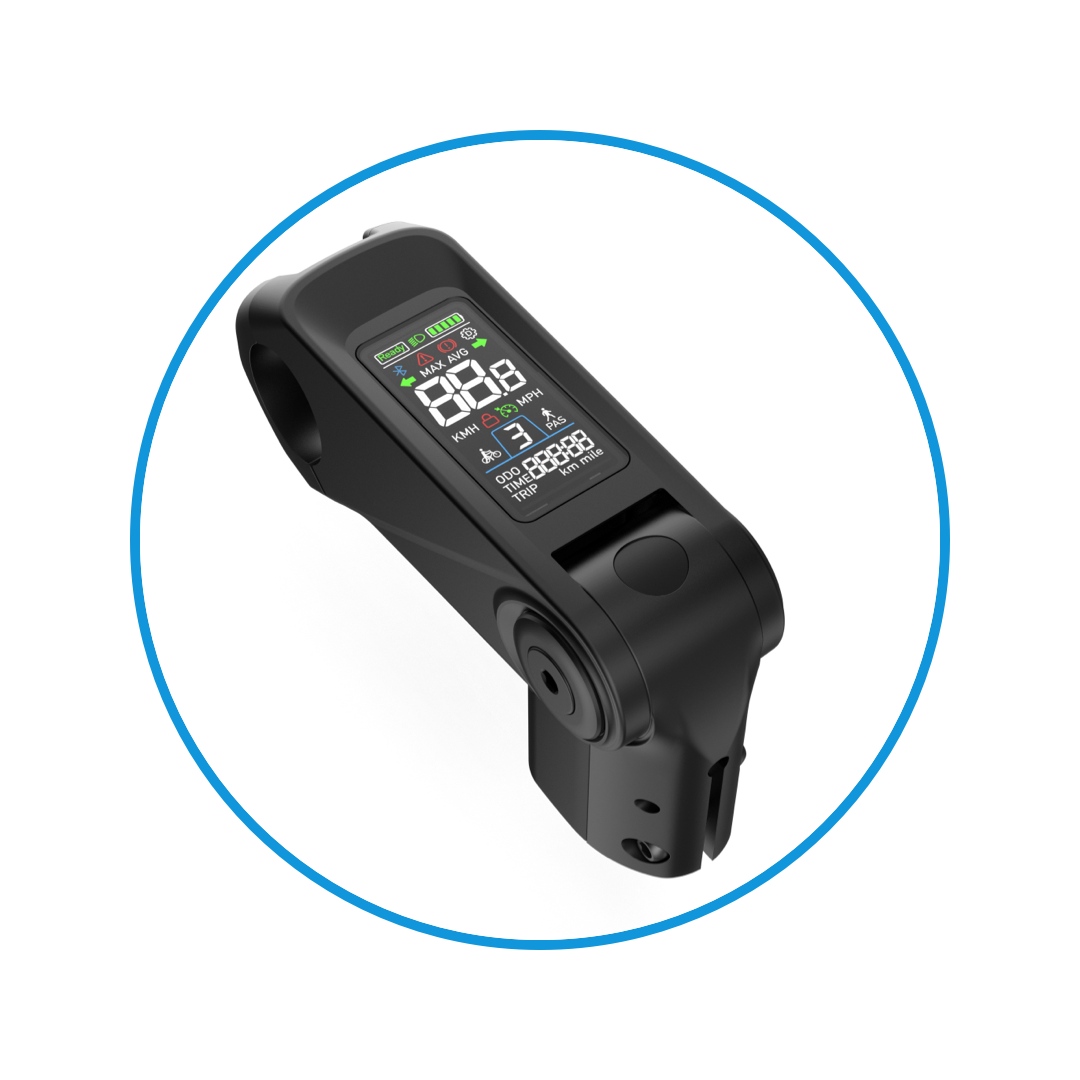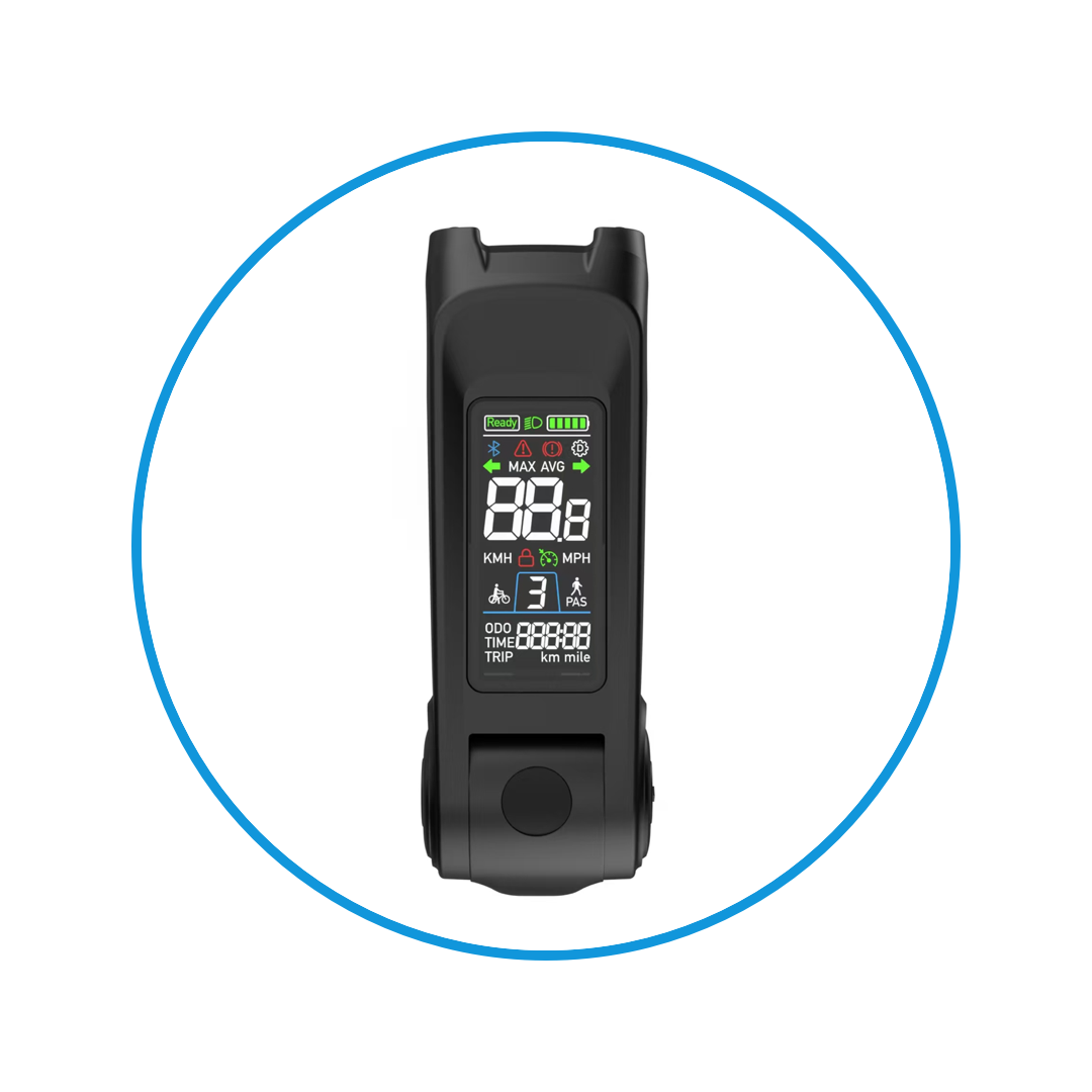显示车辆速度、里程、时间、电量信息,自定义仪表亮度、公英里、启动方式、限速设置,故障检测。
